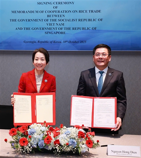 Ngày 30 tháng 10 năm 2025, bên lề Hội nghị Cấp cao Diễn đàn Hợp tác Kinh tế châu Á-Thái Bình Dương (APEC) được tổ chức tại Gyeongju, Hàn Quốc, Singapore và Việt Nam đã ký Bản ghi nhớ Hợp tác (MOC) Thương mại Gạo. Bản ghi nhớ hợp tác được ký bởi Bộ trưởng Bộ Phát triển Bền vững và Môi trường, kiêm Bộ trưởng phụ trách Quan hệ Thương mại Singapore Grace Fu, và Bộ trưởng Bộ Công Thương Việt Nam Nguyễn Hồng Diên.